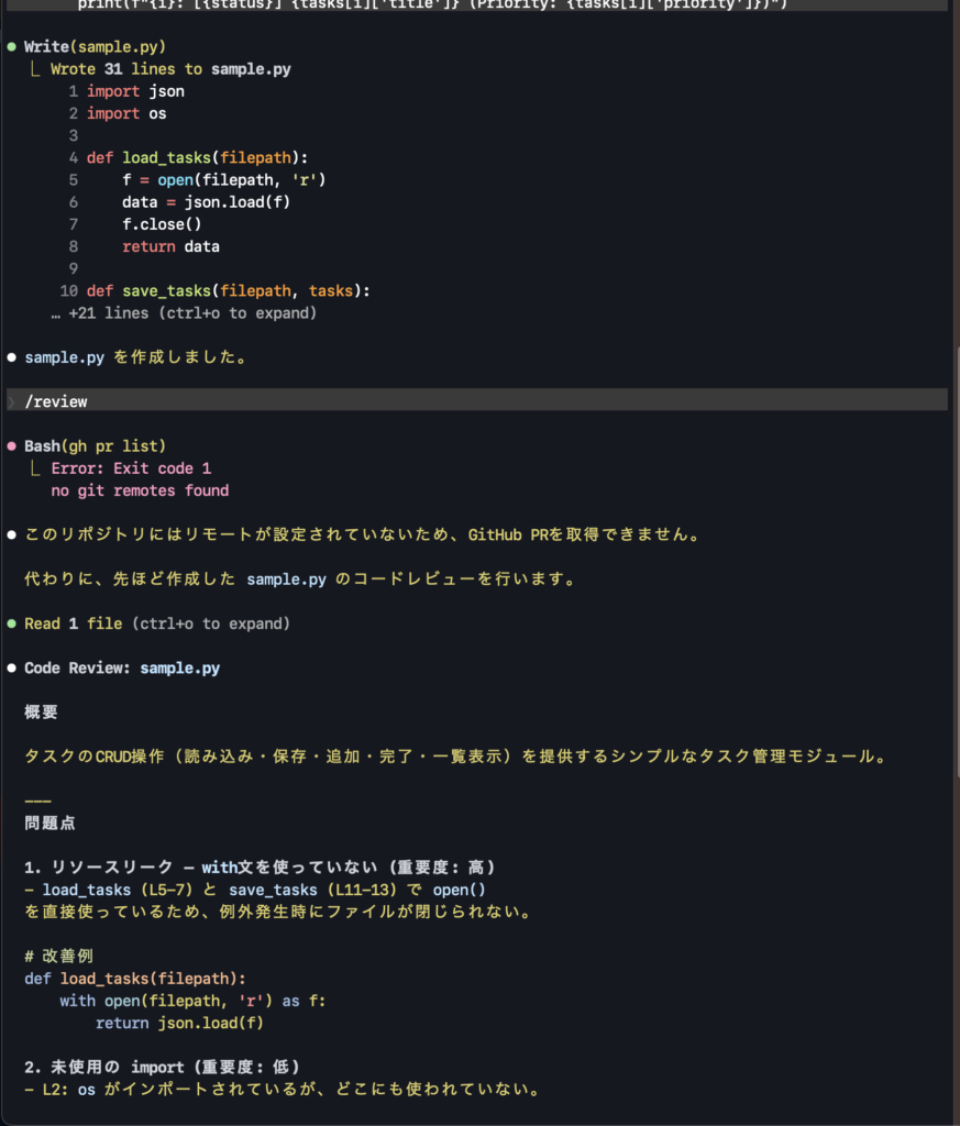 ファイルを作成したら /review を実行します。Claudeがコード変更を分析し、リソース管理の問題(with 文未使用)、エラーハンドリング不足、型ヒントの不足といった改善点を指摘してくれます。