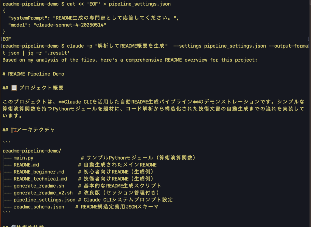 claude -p "解析してREADME概要を生成" --settings pipeline_settings.json --output-format json | jq -r '.result'